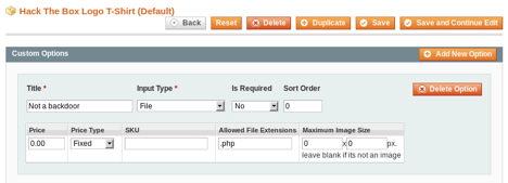 Inside the Admin section, I started looking for vulnerable areas where I could open a shell session with the host, added my own php backdoor code into one of the pages but Magento comments them out, preventing them from running. What I found of interest is that I could edit an existing Product from the Catalog and allow custom file uploads from a customer. I will use this to upload my custom php backdoor.