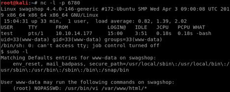 Next, I used the command “sudo /usr/bin/vi /opt/bitnami/wordpress/test.html” to get a vi session as root. vi allows to execute command from its command-mode. Because vi is running as root, we can execute commands with root privileges.