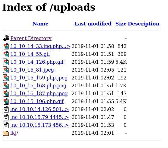 Photos.php includes any file in /uploads that is not index.php. I created a custom payload containing the magic bytes of the gif file format and appended code for a reverse shell. I created a file named payload.php.jpg with the following contents.