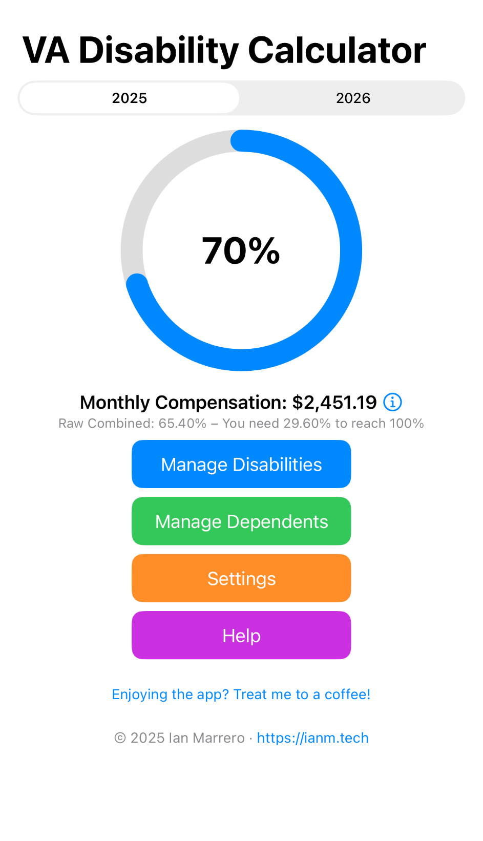 Supports 2025 and 2026 rates now—and easily updated for future VA rate tables.