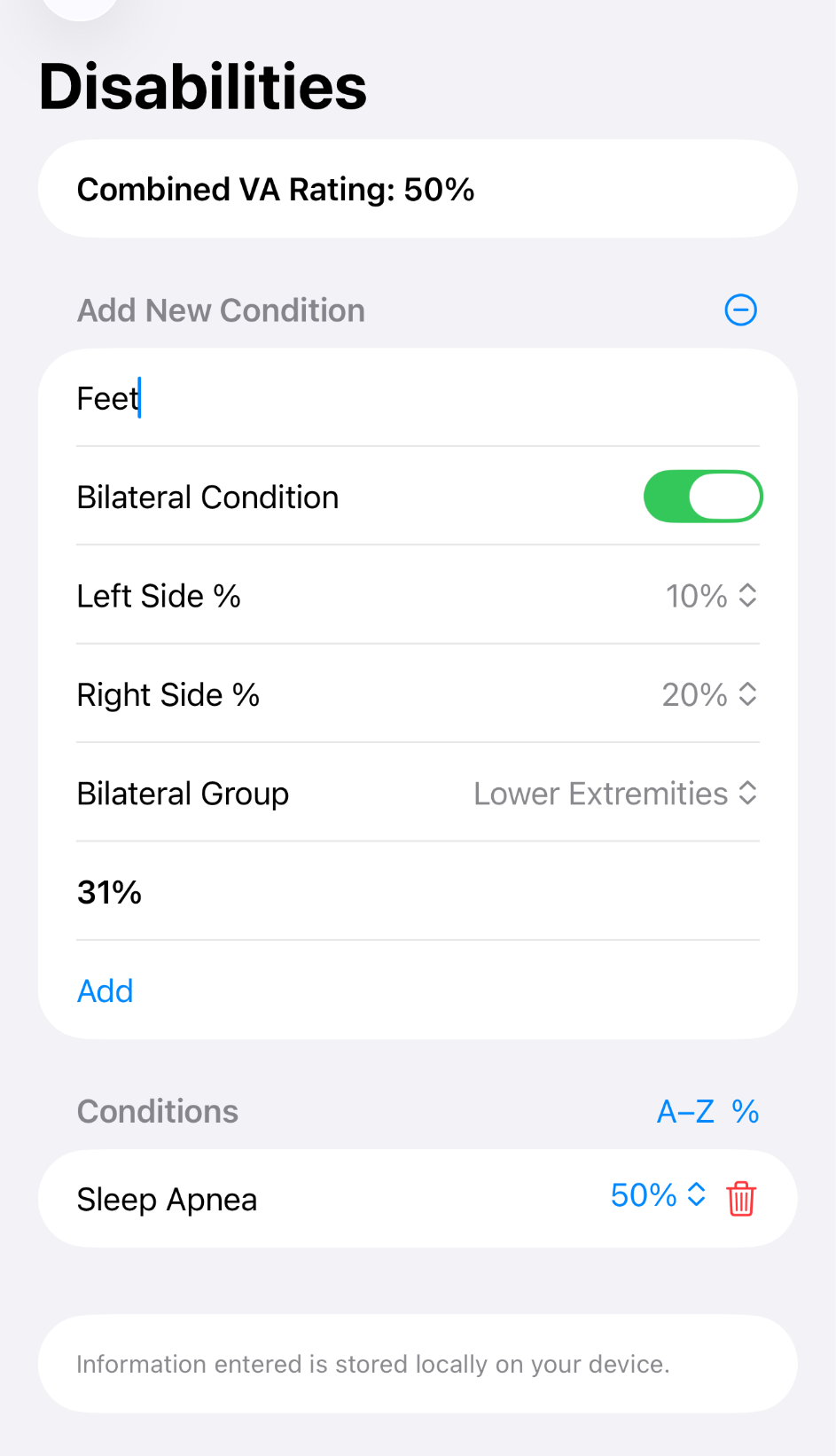 - View both your raw percentage and the VA-rounded rating, with clear thresholds.