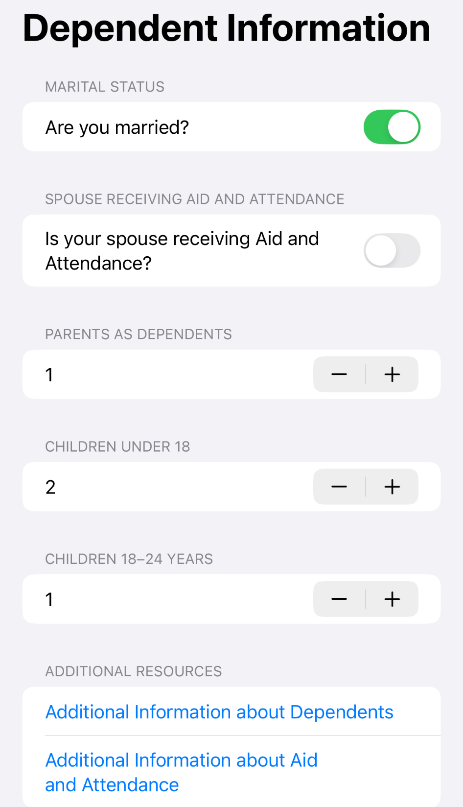 Add spouse, Aid & Attendance, parents, and children; view your estimated benefit, formatted in U.S. currency.